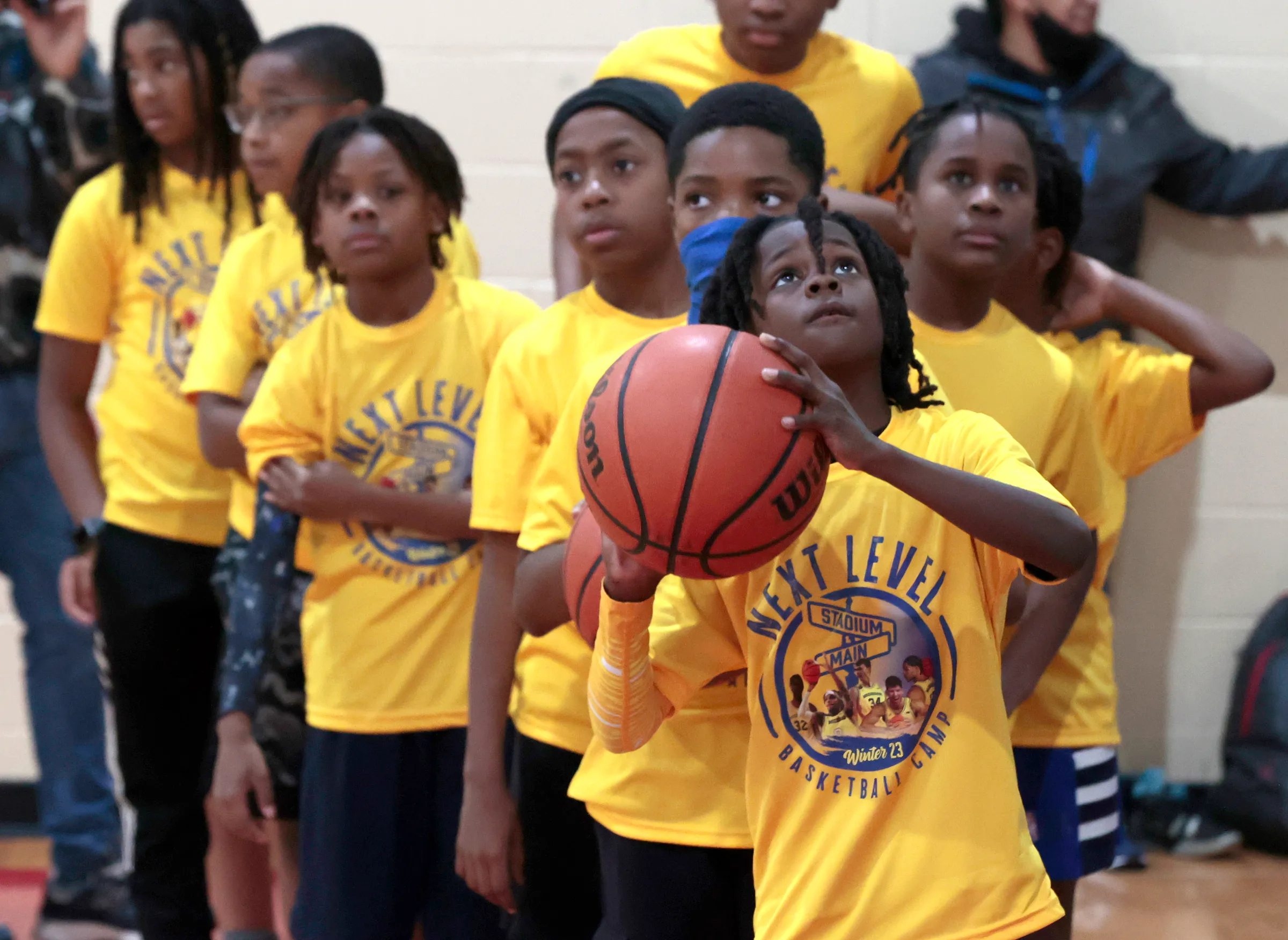 Matthew Williams, 8, of West Bloomfield, concentrates as he tries to make a basket from the side of the rim during the Next Level Basketball Camp at the Say Detroit Play Center in Detroit on Saturday, Dec. 30, 2023.